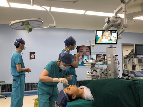 迎著初雪,開始了兩臺“特殊”的手術,在矩陣式的轉播系統(tǒng)下,由我操刀的全切重瞼術+內眥開大術和切提眉抽脂術,在現場轉播演示。高清的畫質讓手術過程中每一處細節(jié)一覽無余,更加考驗操作手法。通過手術演示與講解同步進行,結合現場和手術室實時互動,在各位專家學者的“轟炸”式提問中完成了我的手術演示。