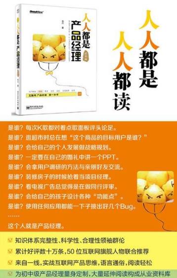 作為一名“4歲的產品經理”作者講述了過去3年的經理與體會,與前輩的書不同,《人人都是產品經理》就像你走到作者身邊,說“嗨,哥們!晚上有空吃個飯嗎,隨便聊聊做產品的事吧”然后作者說“好啊”。