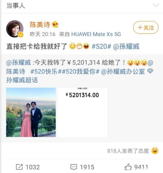 孫耀威在520網(wǎng)絡(luò)情人節(jié)給老婆陳美詩(shī)轉(zhuǎn)了5201314元。