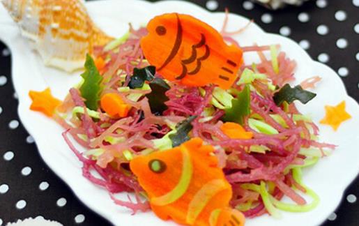 食材:泡發后的珊瑚草50g 、小黃瓜絲 20g、紅蘿卜絲 20 g、辣椒 少量、蒜末 少量 、白醋 一小匙、蠔油 兩大匙、砂糖 一大匙、香油1/2大匙