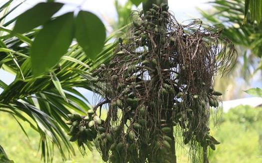 檳榔果略小于雞蛋,果皮纖維質,內含一粒種子,即檳榔子。胚乳堅硬,具灰褐色斑點。于8~11月果實完全成熟之前即予采收,去皮,煮沸,切成薄片曬干,干后呈深褐色或黑色。咀嚼時可以蒟(ju)葉包覆。